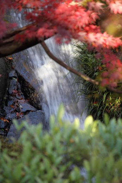 滝の前に赤く紅葉した紅葉入れて撮影しました。
