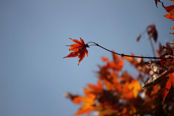 紅葉が一枚、すっと伸びて、日に照らされていたので、撮影してみました。