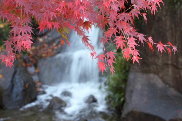 滝のように流れている場所を背景に紅葉した紅葉を撮影しました。