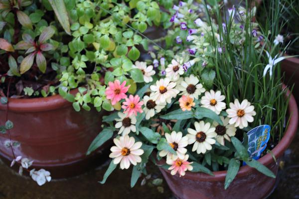 白とピンク、紫の花の写真です。